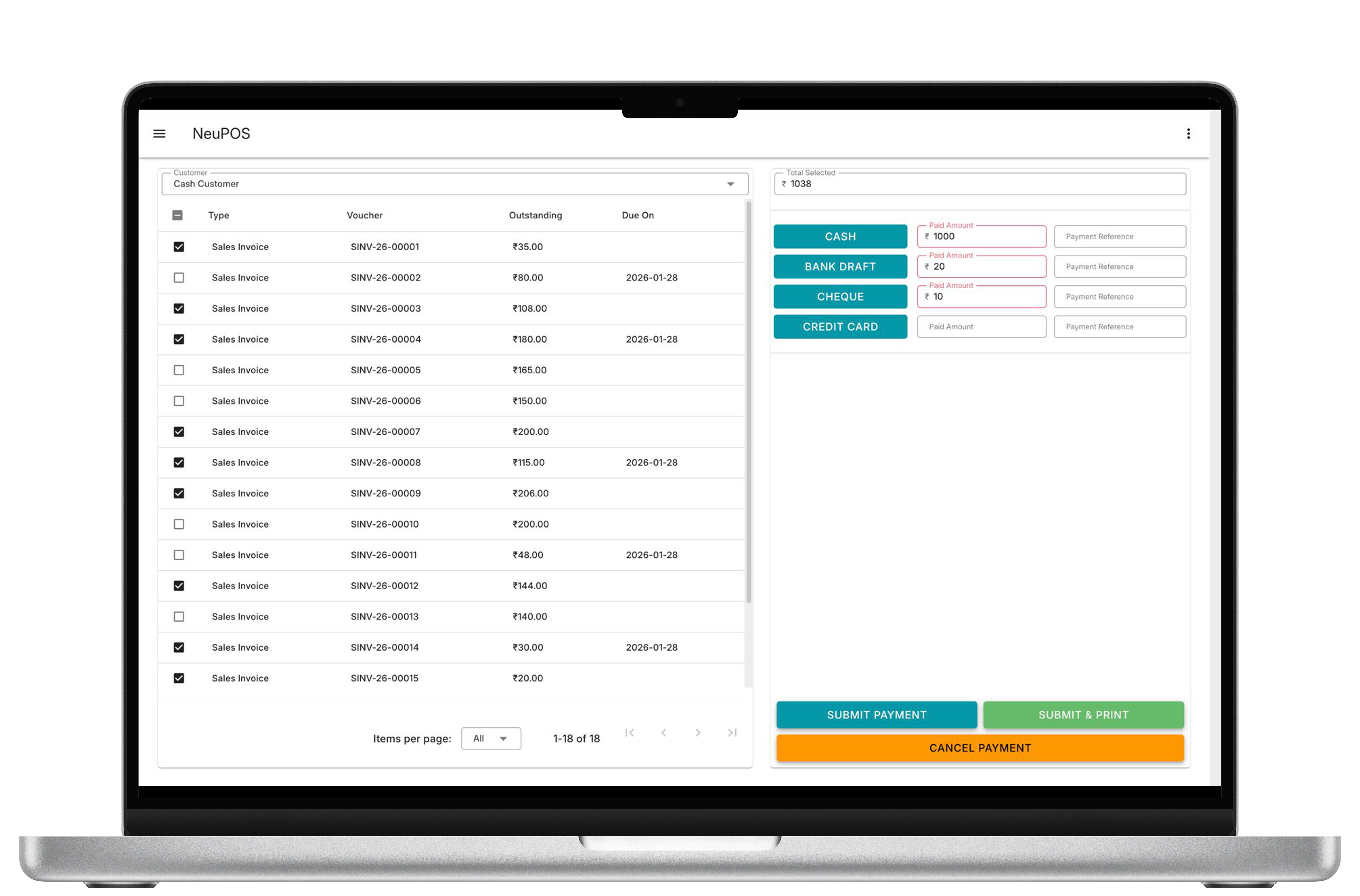Managing customer payments has never been easier. NeuPOS provides a dedicated payment section in the sidebar that allows you to create, track, and manage pending payment entries for each customer with complete transparency.